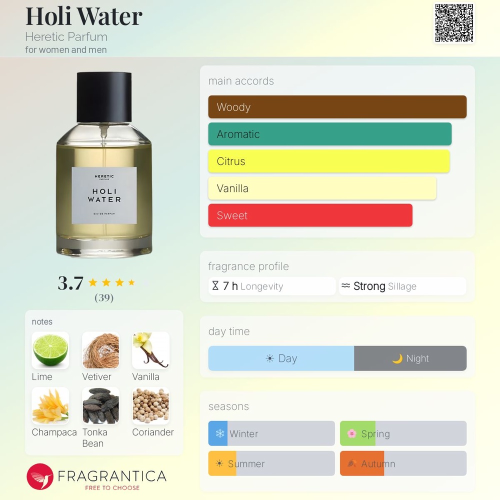 Heretic Holi Water is the 100% natural botanical perfume that asked one of the most provocative questions in modern fragrance: can a perfume made entirely from plants, without a single synthetic molecule, deliver a genuinely transcendent olfactory experience โ one that justifies being named after the holiest water in Hindu ritual? The answer, for those who connect with Holi Water's ethos, is an emphatic yes. Founded by Douglas Little โ nicknamed "Heretic" by an industry that viewed his all-botanical approach as radical โ Heretic Parfum builds every fragrance from 100% naturally derived botanicals, and Holi Water is the composition that best embodies that philosophy. The fragrance opens with kaffir lime and coriander โ bright, green, almost herbal, like crushing a lime leaf between your fingers in a tropical garden โ before settling into a heart of champaca flower absolute, one of the most revered natural absolutes in artisan perfumery: a creamy, complex floral with narcotic depth and golden warmth that has been used in Indian religious and meditative practice for millennia. The base unfolds as vetiver, vanilla absolute, tonka bean, patchouli, and sandalwood โ a rich, resinous, slightly smoky foundation that gives Holi Water its contemplative, introspective character. The 100% natural formulation means every molecule comes from botanical sources โ no synthetic musks, no synthetic fixatives, no aroma chemicals reconstructed in a lab. This creates a scent that evolves more dynamically than synthetic-anchored fragrances: the top, heart, and base notes transition more organically, the scent interacts more directly with skin chemistry, and the overall impression is closer to smelling an actual botanical garden than a perfumery lab. The trade-off โ and it is an honest one โ is performance. Natural fragrances, absent synthetic fixatives designed for 12-hour longevity, typically have more modest sillage and wear time. Holi Water is a close-to-skin experience, not a room-filling projector. Champaca flower, the spiritual heart of the composition, has a long history in contemplative practice. Contemporary research on natural absolutes rich in linalool, geraniol, and benzyl acetate โ all present in champaca โ has documented effects consistent with nervous system calming and emotional regulation. Champaca specifically has been used for centuries in Indian temple offerings and meditation rituals for its perceived ability to facilitate introspection and spiritual presence. For anyone who believes perfume should be made entirely from what the earth grows โ and who values a contemplative, spiritual, intimate fragrance experience over synthetic longevity and aggressive projection โ Holi Water is one of the most uncompromising expressions of that philosophy available from a recognized, artisanal American perfume house.